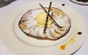 Después de todas estas delicias, nos trajeron finalmente el postre. Una tarta fina de manzana, sobre una base de hojaldre, acompañada con una bola de helado de vainilla y con azúcar glass espolvoreado.